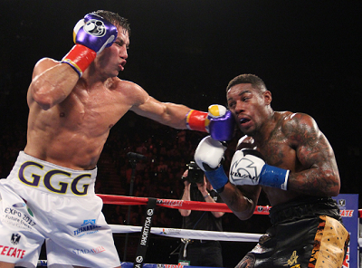WBA世界ミドル級“スーパー”王者でWBC同級暫定ベルトも保持するゲンナジー・ゴロフキン(カザフスタン)がまたも横綱相撲。16日(日本時間17日)ロサンゼルスのザ・フォーラムで行われたWBAタイトル14度目の防衛戦で、挑戦者WBA2位ウィリー・モンローJr(米)を3度倒し、6回45秒TKO勝ちした。 モンローに左を叩きこむゴロフキン(左)