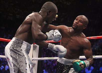 メイウェザーは6回にエンジンをふかし、アッパーやボディブローの連打、ロングからの右フックを披露。7回に軽い左フックをもらったが、余裕からフットワークも使うようになって乗ってきた印象。8回にはショートの連打やワンツーを決め、試合はワンサイドの様相を呈してきた。10回はラウンド中しきりに言葉を発した両者に対し、主審のケニー・ベイレスが注意を与えた。