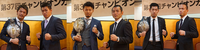 無敗のままプロ6戦目で日本L・フライ級王座を獲得した拳四朗(BMB)は世界挑戦経験のある角谷淳志(金沢)と対戦。世界ランク入りも果たした拳四朗は「チャンピオンではあるけれど、挑戦者の気持ちでいく」と語り、対する角谷は「日本タイトルは2度目。拳四朗選手は強いけど、今回は絶対に勝つ」と闘志を燃やした。