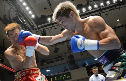 低い姿勢で左ジャブを突いて出た日本フェザー級5位の坂は右フックをジャストミート、いきなりダウンを奪う。立ち上がった中嶋(日本S・バンタム級15位)だがダメージは深く、坂の左右ラッシュに防戦一方。ここで再びカウントが入り、再開後も坂が勢いを弱めず右ストレートを決めたところで福地主審がストップを宣した。快勝の坂は14勝11KO3敗。中嶋は25勝10KO9敗1分。