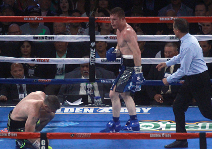 スタートからカネロがフック、アッパーを中心にしたパワフルなコンビネーションを打ち込んでリード。スミスもパンチをリターンして引く素振りを見せない。世界チャンピオンが14人もいる英国王者の一角スミスのブローがまともにカネロを捕らえるシーンもあるが、パワーの差は歴然。メキシカンにダメージを与えることができない。英国人は5回、右目周辺を2個所カット。しかし手を出して食い下がり、断続的にカネロをロープへ送る場面をつくる。
