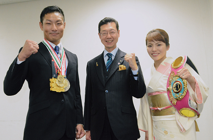 9月に4度目の防衛を果たし、リング上で結婚を発表したWBO女子世界ミニ・フライ級王者の池原シーサー久美子(32=フュチュール)が14日、地元の大阪市大正区役所を総合格闘家の夫、出花崇太郎さん(31)とともに訪れ、筋原章博・大正区長に勝利報告した。