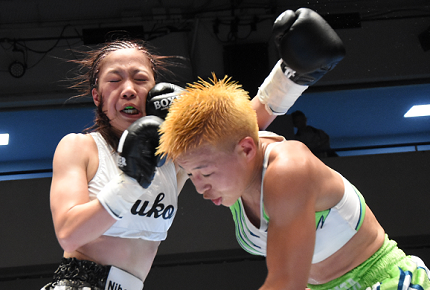 両者は13年に2度対戦して花形の1勝1分。3度目の対戦も花形が低い姿勢からチャンスをうかがい、サウスポーの黒木が足を使いながら左を狙う展開。パワーで上回る花形が2回からプレスを強め、3回には右フックで黒木をロープまで飛ばした。