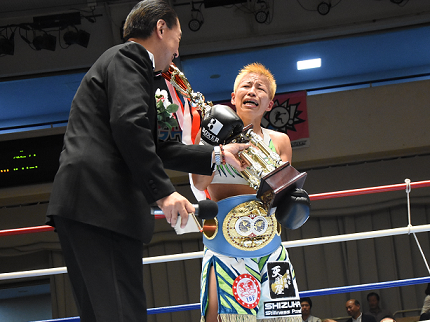 花形はリングネームをもらった花形進会長と同じ5度目の挑戦で世界タイトルを獲得。採点が読み上げられたあとは、花形会長を肩車して喜びを表した。