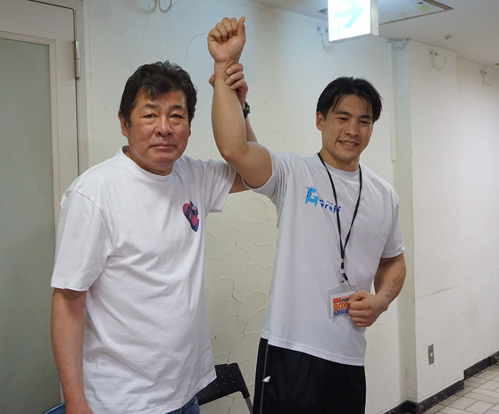 赤井は「もらってから目が覚めた。(ダウンを奪った)右アッパーは練習していなかったけど、空いていたから出した」と初勝利にホッとした表情。英和さんから「英五郎のパンチが強いのは足が強いから。今日は足からのパンチが出た」と評価を受けた赤井は「今日は運良く勝てたけど、僕もパンチをもらった。直さなくちゃいけないところを直して次の試合に臨みたい」と気持ちを引き締めていた。