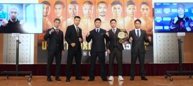 「U-NEXT5」の発表会見が27日、東京都内のホテルで開かれた。3月15日(日)横浜BUNTAIで行われる今回のイベントはトリプル世界タイトルマッチと世界挑戦者決定戦というラインナップ。当日はU-NEXTでライブ配信される。photos/...
