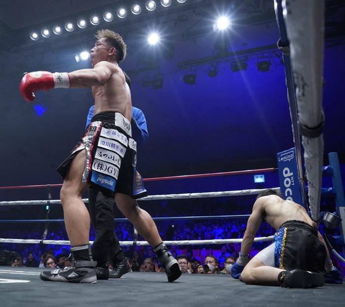 However, Sunagawa’s heavy blows had already caused Narai’s cheeks to flush and swell from the start, hinting at the drama to come. That explosion occurred in the eighth round. Sunagawa countered Narai’s left with a return right straight, sending Narai to the canvas on his backside. After the champion stood up, Sunagawa dropped him a second time with a short right, filling the hall with the atmosphere of an impending comeback KO victory.