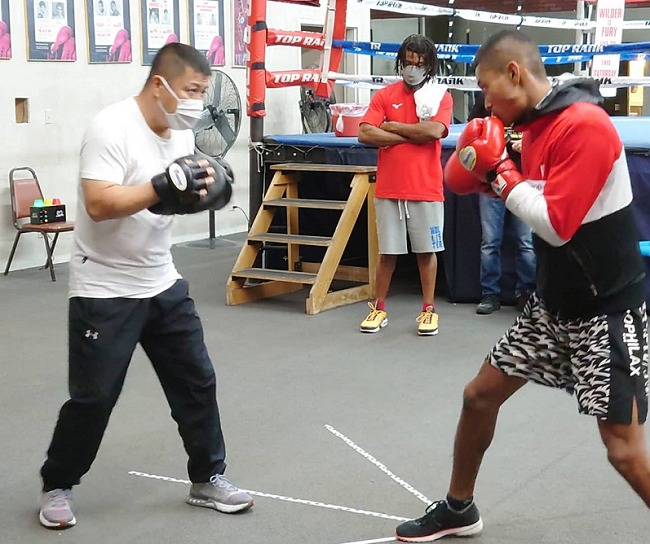 After the interview ended, Inoue returned to his hotel room instead of the Top Rank Gym and engaged in a light training of punching mitts held by Ohashi Boxing Gym trainer Kosuke Ota in the room
