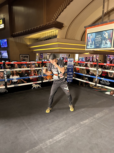 The left-handed Nakatani, 25, displayed shadowboxing on the specially built ring at MGM Grand Hotel’s Casino before many onlookers. He was quoted by the gym as saying, ‘’I was able to do my training relaxed amid many customers as many of them cheered me up. I felt a sense of excitement.’’