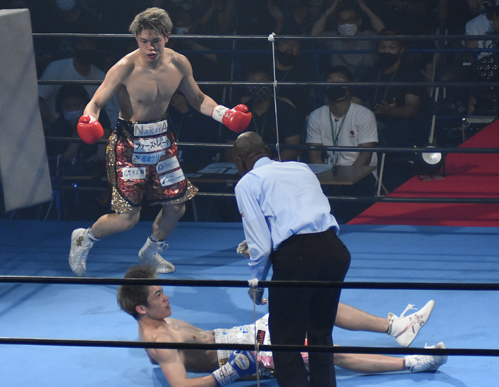 Up until the stoppage, Tanaka controlled the fight throughout against his gusty opponent by landing various punches, including body shots.