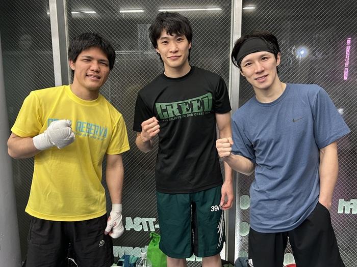 同じ14日に試合をする先輩王者の佐川遼(中央)、中川健太(右)と