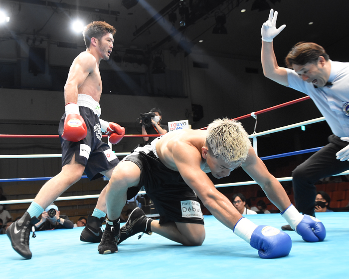 互いに左を差し合い、伊賀がワンツーにつなげた。しかし初回終了間際、左右田が左フックでダウンを奪う。2回に左右のボディ打ち。迎えた3回、右を決めてダメージを与えると、左フックで伊賀をキャンバスへ。伊賀は立ち上がったものの10カウントとなった。