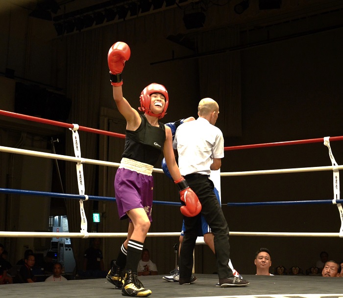 出場選手には現役プロで前WBC世界L・フライ級チャンピオンの矢吹正道(緑)の長女、佐藤夢月(U15/女子40㌔級/緑)をはじめ、元プロ選手の子どもたちもいた。佐藤は3回TKO勝ちで昨年に続き優勝を決め、セコンドのパパを喜ばせた。