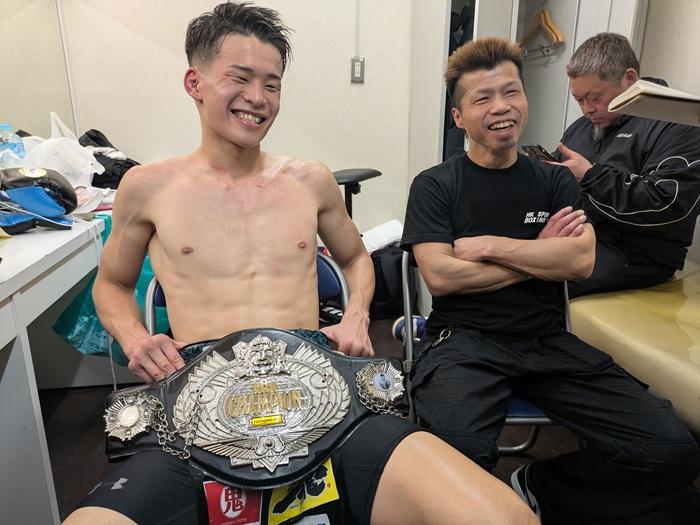 「もっと満足できる内容にしたかった。ここからがスタートです」とうな垂れた岡本。だが、ジム初の王者誕生に加え、ちょうどこの日が22歳の誕生日とダブルで祝福されると、傷ひとつない満面の笑顔を浮かべた。