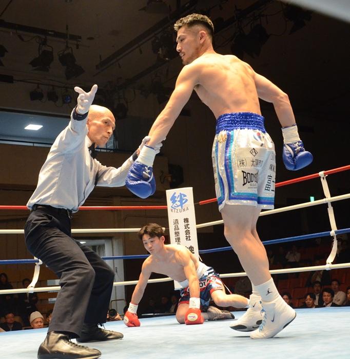 クイックなのは小山だったが、その派手な動きの隙を平野が冷静に突いた。右ストレートを顔面に届かせて間合いに感触を得ると、もう一度右クロス、さらに右で追い打ちして小山をダウン。再開後一度はしのいだ小山だが、平野がしっかりタイミングを計って打ち込んだ右で再び痛烈なダウン。即座にストップとなった。