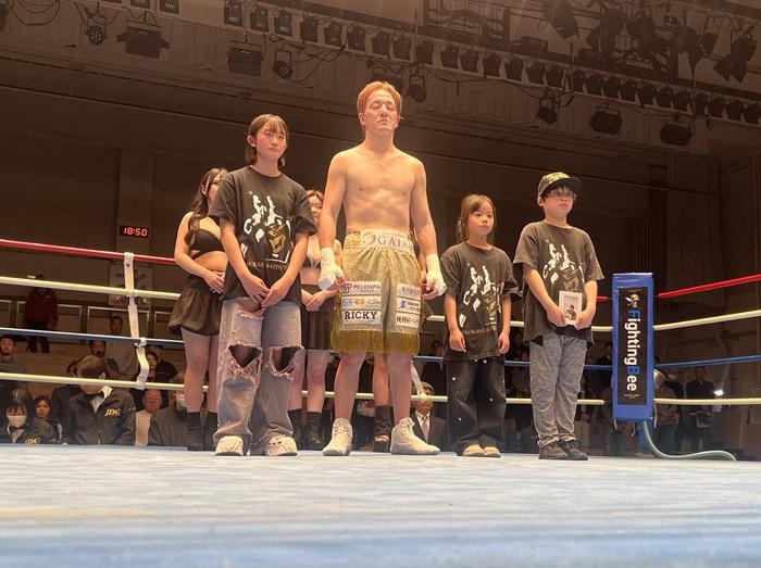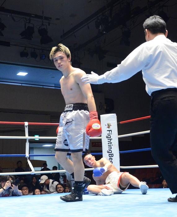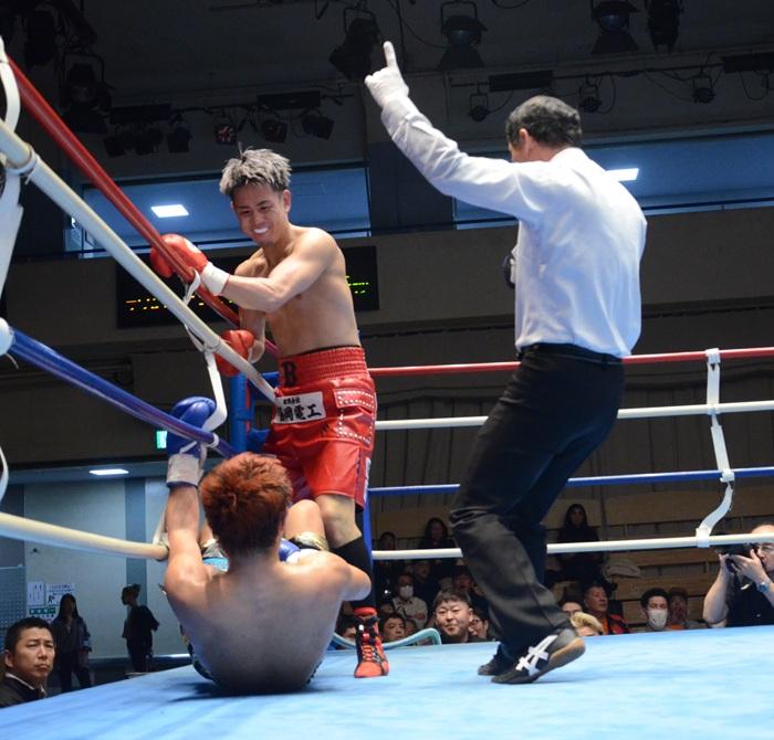 矢代も負けていない。右フックや左オーバーハンドなど多彩な攻めで金城をプレス。そして迎えた3回、いきなりの右フックを炸裂させて金城をダウン。金城は立ち上がったものの岡庭主審がストップした。