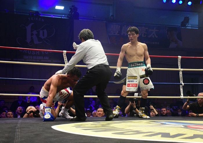 迎えた9回、一気に決めにかかった豊嶋は、長い右ストレートをクリーンヒット。キャンバスに倒れ込んだバカロを見て、レフェリーが試合を止めた。