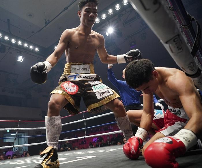 ここは立ち上がったメンドサだったが、タノンサックは一気に試合を決めにかかり、ロープを背負わせた状態から右強打をねじ込むとメンドサが体をひねりながら倒れ込んで大の字に。メンドサは辛くも立ち上がったもののダメージが深く、レフェリーにカウントアウトされた。