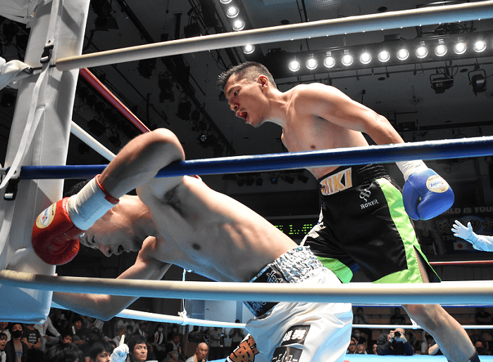 2回、天海はKOを狙ってスピードに乗って攻め、左ボディから顔面への連打につなげてサオワラックをキャンバスへ。さらに左フックで2度目を追加した。3回に左ボディで3つめを奪うと、最後は怒濤のラッシュで4度目を奪い、試合を終わらせた。