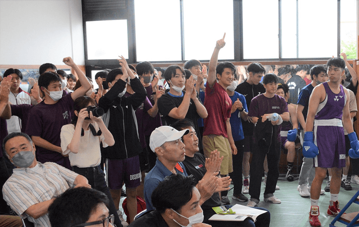 7月16日の最終週を残しているが、事実上の優勝決定戦とみられた大阪商大と同志社大の争いは、同志社大がミニマム級不戦勝に続いてフライ級は昨年のピン級高校2冠の定廣征季(1年、京都廣学館)が大商大の主将、青山思惟(4年)の接近戦を阻んで3-0の判定勝ちで好スタートを切った。しかし、大阪商大はバンタム級・浅井陸(2年)、フェザー級・高岡賢伸(3年)がともに強打でストップ勝ちして2-2のタイに戻した。