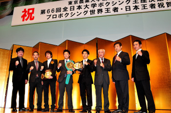 東農大初の大学王座戦3連覇達成と同時に、同校OBのプロ選手の活躍を祝った。パーティーには山根明・日連会長はじめ、プロからも大橋秀行JPBA会長らが出席。東農大ボクシング部メンバーが紹介され、また井岡一翔(WBA・L・フライ級)、五十嵐俊幸(WBCフライ級)、清水智信氏(WBA・S・フライ級)、岡田誠一(日本S・フェザー級)のチャンピオンたちが称えられた。
