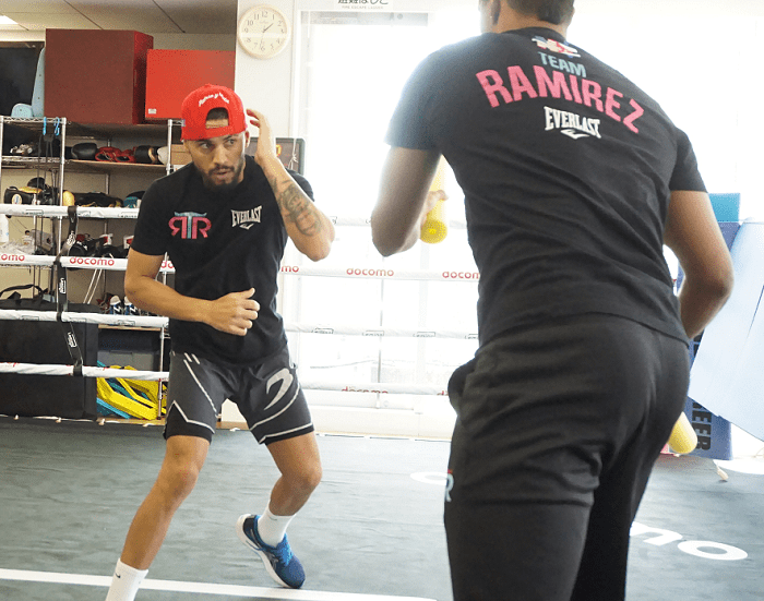 7月25日の有明アリーナで清水聡(大橋)の挑戦を受けるWBOフェザー級王者ロベイシー・ラミレス(キューバ)が18日、横浜市内の大橋ジムで練習を公開した。記者会見には日本でお馴染みのイスマエル・サラス・トレーナーも同席した。