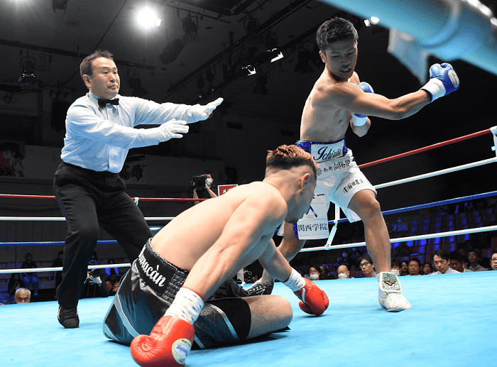 飯見がいきなりプレスをかけ、サウスポーの宮本がこれを迎え撃つ。開始30秒、宮本が左ショートを合わせると、飯見が崩れ落ちてダウン。立ち上がった飯見は足がいうことをきかず、宮本が畳みかけて右フックで2度目を追加。ここも飯見は踏ん張ったが、宮本が攻め立て、最後は主審が試合を止めた。宮本は9勝8KO8敗。飯見は6連敗で7勝7KO7敗。