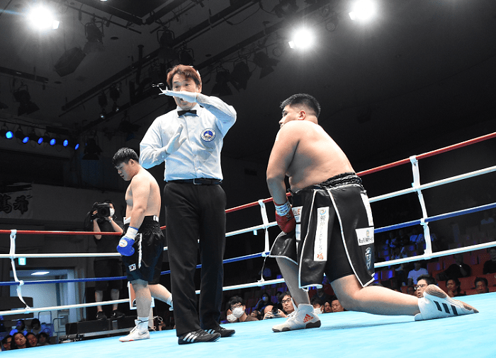 5カ月連続の試合でキャリアを重ねようという但馬は6月以来のリング。125キロの但馬が何度か鋭いジャブを放ち、104.6キロ韓国王者キムが時折フックを打ち込むものの、互いに様子を見てアクションの少ない立ち上がり。3回、レフェリーから互いに手を出すよう促した。