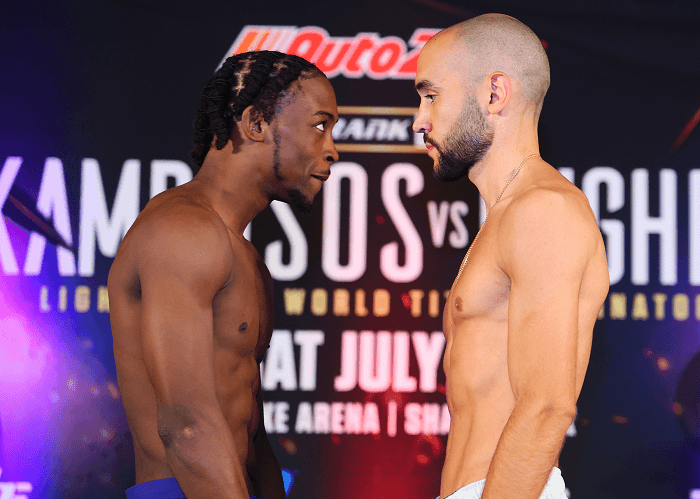 明日22日(日本時間23日)米オクラホマ州ショーニーでトップランク社が開催するイベントの計量が21日行われた。メインのライト級12回戦は、前ライト級統一王者ジョージ・カンボソス(豪州)が134.6ポンド(60.05キロ)、IBFライト級9位マキシ・ヒューズ(英)が134.7ポンド(60.10キロ)を計測しリミット135ポンドをクリア。試合はIBFライト級挑戦者決定戦としてゴングが鳴る。