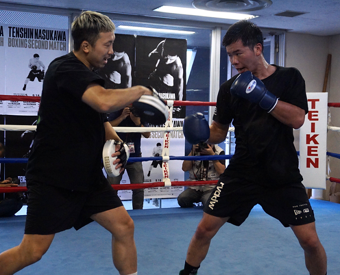 ラスベガス合宿ではパートナーから左ボディアッパーでダウンを奪い、帰国後のスパーリングでも「相手は最初のスパーリングでまったく何もできなかった」(粟生隆寛トレーナー)と遺憾なく実力を発揮している那須川。この日も2人のメキシカンを相手に4ラウンド、出入りのスピード、カウンター、上下へとキビキビした動きを存分に披露した。