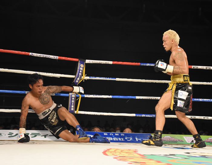 湯川は初回にボディーを攻めた後、一転右フックをアゴに決めてダウンを奪うと、2回に同じような右を叩き込み再びタイ選手をキャンバスに沈めた。スラシットは初回終了ゴング後足を引きずってコーナーに戻るなどダメージは深刻。2回のダウンも立ち上がったが、主審はそのまま10カウントを数えた。湯川は5月の前戦で初黒星を喫し、これが再起戦だった。8勝7KO1敗。敗者は3勝3KO4敗。