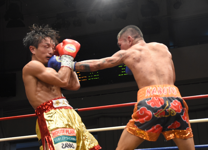 千葉の名門、習志野高で国体3位に入ったサウスポー佐伯は右を狙ってくるナッチャポンに対し、初回終了間際に左を合わせてダウンを奪った。スピードとパワー、パンチの回転力では佐伯が明らかに上。2回、左ストレートから右につなげて2度目のダウンを追加すると、最後は連打から左アッパーで3度目を追加。主審が試合を止めた。佐伯は3勝3KO。ナッチャポンは5勝3KO6敗。