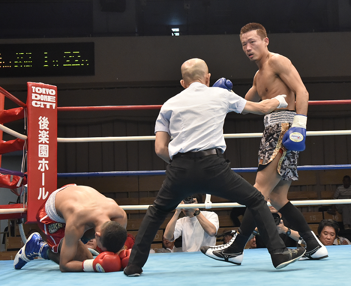 2回以降、大湾はパイのカウンターに注意しながら仕留めにかかった。パイは小さく、頭を下げてパンチをよけるので、なかなか当てるのが難しい。それでも大湾は4回、右ストレートでパイをコーナーに追い込むと、右アッパー、左ボディを浴びせてダウンを奪う。もう一つダウンを追加して試合を終わらせた