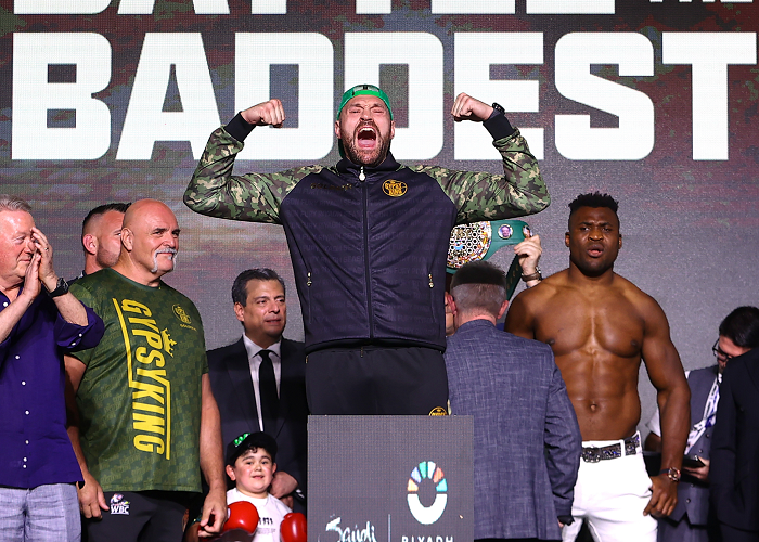 明日28日(日本時間29日)サウジアラビアのリヤドでゴングが鳴る「バトル・オブ・バディスト」(最高の男たちの戦い)、WBCヘビー級王者タイソン・フューリー(英)vs.元UFCヘビー級王者フランシス・ガヌー(カメルーン)の計量が27日行われた。ハカリに乗ったフューリーは277.7ポンド(125.96キロ)、ガヌーは272.1ポンド(123.42キロ)を計測。試合はボクシングルールによる10回戦で行われる。