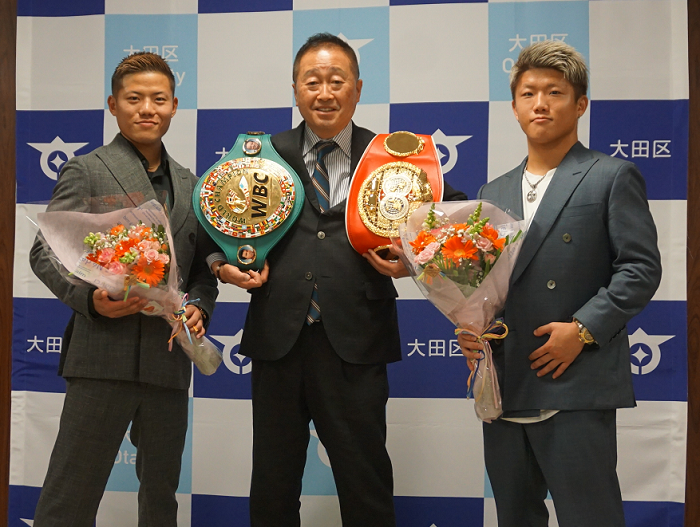 WBCミニマム級王者の重岡優大と弟のIBF同級王者、重岡銀次朗が20日、所属するワタナベジムの渡辺均会長と大田区役所に鈴木晶雅区長を表敬訪問した。