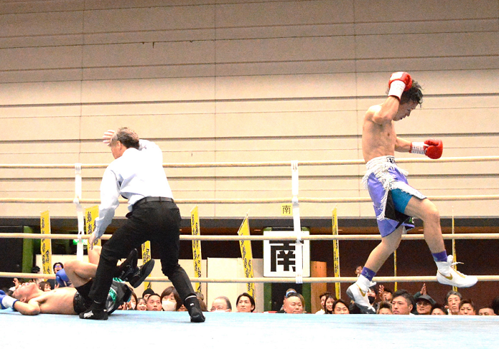 ハラダジム主催の「Fighting Beat Boxing」は25日、大阪市のエディオンアリーナ大阪第2競技場で開かれ、メインの57.8キロ8回戦は日本フェザー級9位の亀田京之介(25=ハラダ)が元日本ユース同級王者、松岡輝(28=大成)が対戦、亀田が7回右アッパーを決めてKO勝ちした。