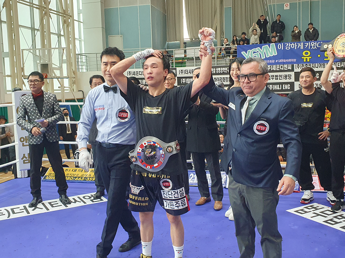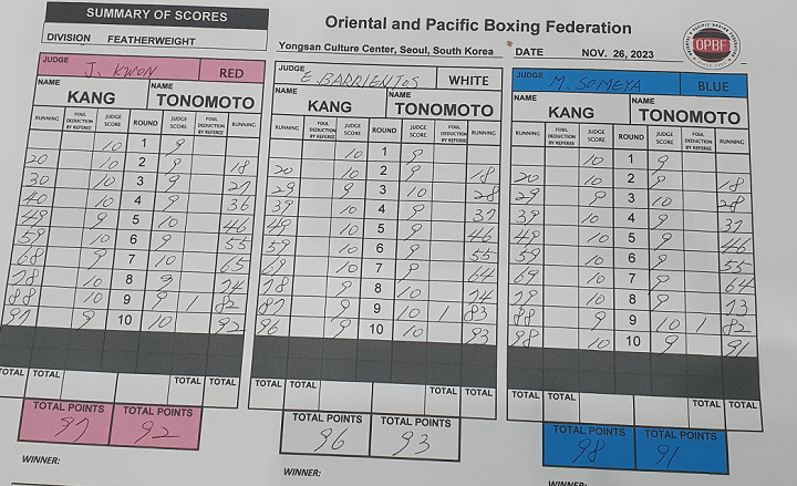 スコアは98-91,、96-93、97-92。殿本は連勝が5でストップ。戦績は14勝7KO4敗1分。22歳のカンは18勝9KO1敗1分。Photos by Eun-sang, Cho