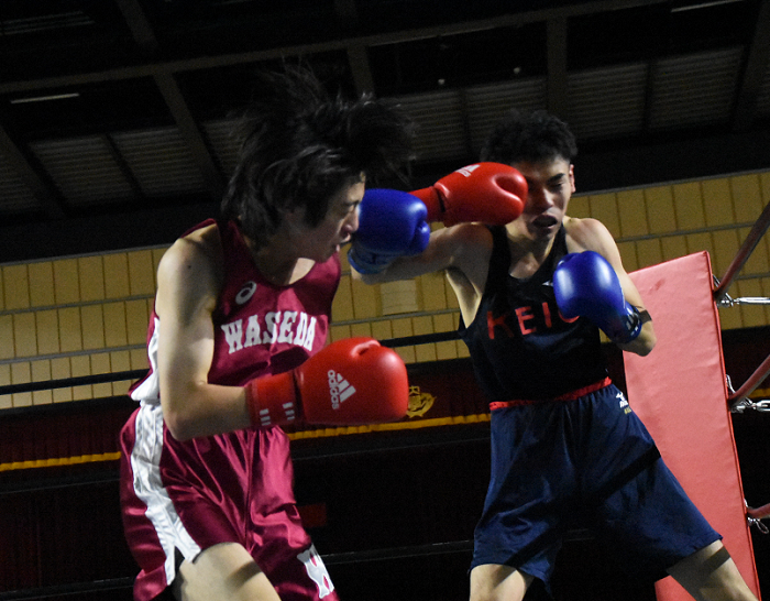第1回大会が開催されたのが昭和4(1929)年という伝統の定期戦。私学のライバル校だけにいつも盛り上がるが、関東大学リーグ2部の慶應と3部の早稲田の差が試合にもあらわれ、今回も慶應が圧倒した。初戦のフライ級で2年生ながら主将に抜擢された山﨑博雄が早大の後藤誉雄を初回にとらえてRSC勝ちしたのを手はじめに、ウェルター級まで7戦をすべて勝利。