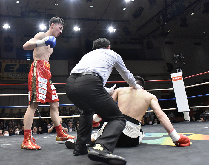 2回も関根が先手で攻めて右ボディ、右フックで青コーナーのファンをわかせた。藤田はラウンド終盤、強烈な右フックを叩き込んだ。3回、藤田の左フックで関根がぐらつき、追撃でダウン。立ち上がった関根はここから攻め手に転じ、2分あまりをしのぎ切った。