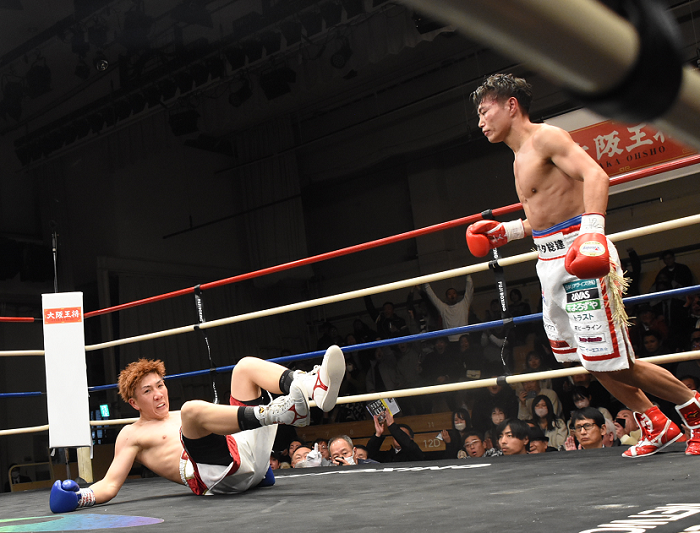 サウスポーの保田は初回、佐伯の入り際に右フックを合わせる立ち上がり。左のカウンターも鋭かった。佐伯も臆せず攻めたが、2回、離れ際に保田の右で佐伯がキャンバスに転がる。ダウンのコールに佐伯は首を振ったが、確かにダメージはなかった。