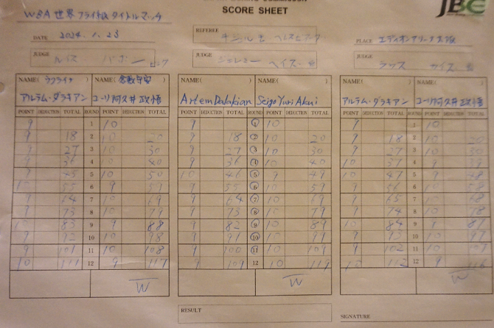 ともに決め手を欠いたが、読み上げられたスコアは、1人目が116-112、117-111、119-109。ジミー・レノン・ジュニア氏が「ニュー!」とアナウンスすると、阿久井がガッツポーズで喜びを表現した。