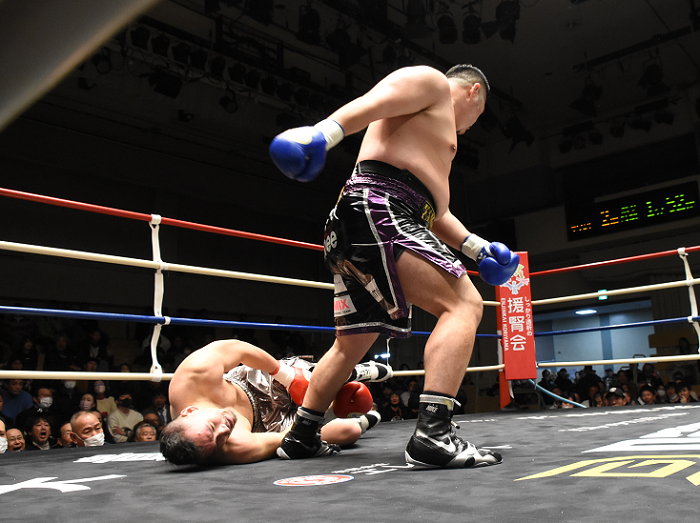 立ち上がりはジャブの差し合いで兒玉が優位に立ち、ボディ打ちにつなげていく。しかし日本ウェルター級9位の星はラウンド後半、右ストレートを続けて決めた。