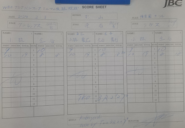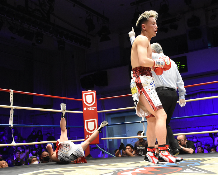 2回、金谷はよく動きがら左アッパーを決めたが、小林は右フック、右アッパーで金谷に迫った。ラウンド終盤、小林の左フックで金谷がキャンバスに転がった。