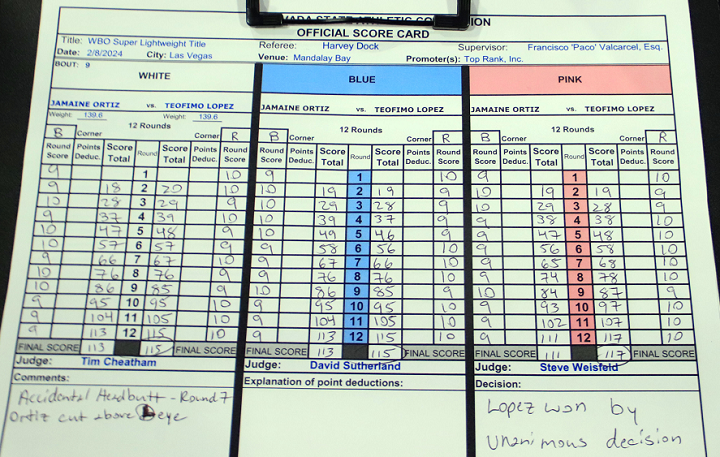 元ライト級3団体統一王者オルティスの絶対有利が伝えられる試合だったが、ロペスは技巧派サウスポー“ザ・テクニシャン”オルティスをつかまられずにラウンドを重ねた。客席からブーイングが何度も起きる中、ロペスは終盤にギアを上げて前に出て、効果的な攻撃を見せられなかったものの、117-111、115-113×2で勝利した。