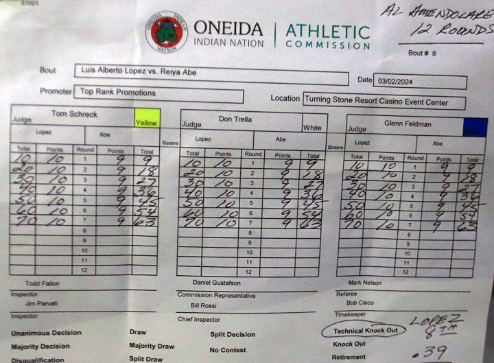 ようやく6回、阿部の手数が少し伸び、ロペスのペースダウンも手伝って、阿部が攻勢の印象。ロペスは7回、両手を下げて阿部を挑発する。阿部がロープを背負うシーンが増え、ストップの不安が膨らんだ。8回、ロペスが右グローブを掲げて観客に合図してからラッシュ、阿部はガードを固めるしかなく、ストップとなった。