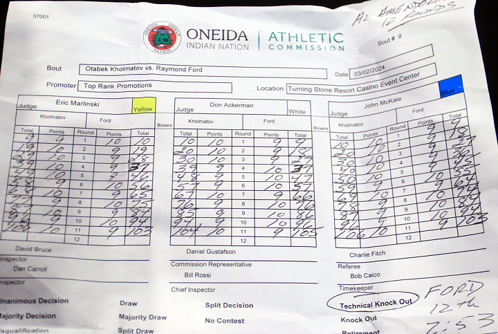 11回はコルマトフが攻めた。12回もコルマトフが優勢に見えたが、フォードの右アッパーが火を噴くと、コルマトフがダメージを負った。追撃でキャンバスに転がると、これはスリップの裁定。しかし立ち上がったところにフォードが畳みかけると、コルマトフが横を向いてコーナーに後退。背中を見せたところにフォードが左を叩き込むと、レフェリーが試合を止めた。