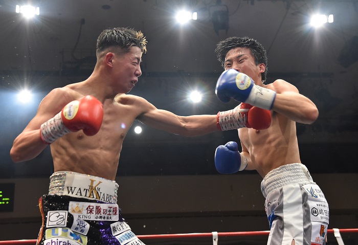 王者の渡邊が東洋大出身でプロ3戦目の大畑との初防衛戦を迎えた。渡邊は射程の長いジャブ、ストレートを上下に散らし、大畑は遠い距離から飛び込んでワンツーを狙ったが、序盤は互いに見合う時間が長く、アクションが少ない。3回、大畑がカウンターで右を決め、渡邊も決め返した。