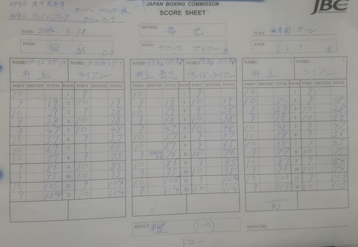 終盤も接戦が続いた。9回はライアンが打ち終わりに左アッパーをクリーンヒットしたが、それ以外は一進一退の印象。井上は圧力をかけきれず、ライアンも井上のガードを崩せず、互いにはっきりとポイントを取れないまま試合は終了。