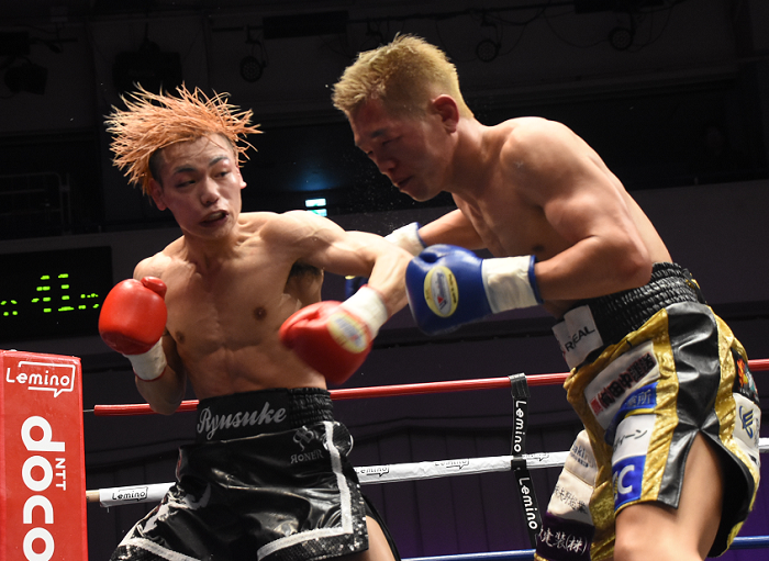 5回、砂川が右ボディアッパーを効かせて畳みかけるが、タフな湯川は左右のフックを強振。激しい打ち合いとなった。