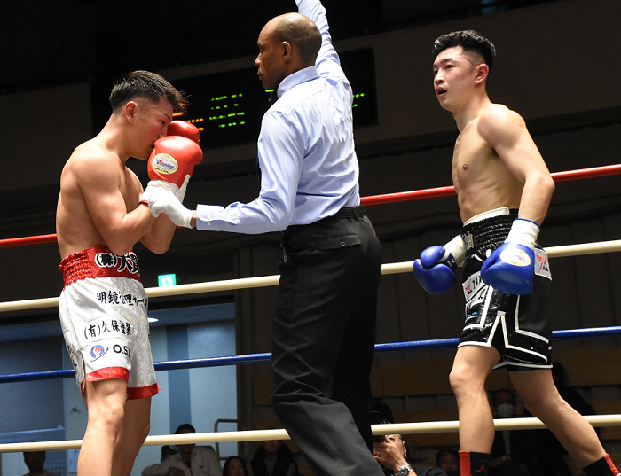 強打が自慢の山内は3回、強引に前に出たが、野田が右、左ボディを効かせて山内をキャンバスに突き落とす。立ち上がった山内にラッシュしたところでストップとなった。拓大出身の野田は快勝で4勝2KO3敗。山内は9勝6KO4敗1分。
